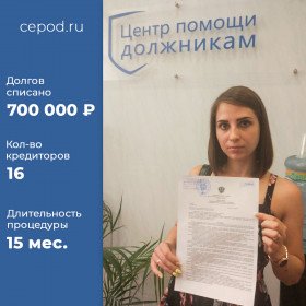 Списано долгов на 700 000 р. за 15 месяцев. Кол-во кредиторов - 16 шт.